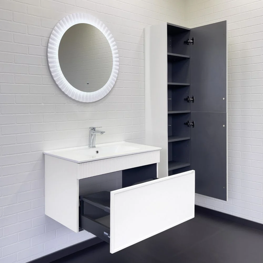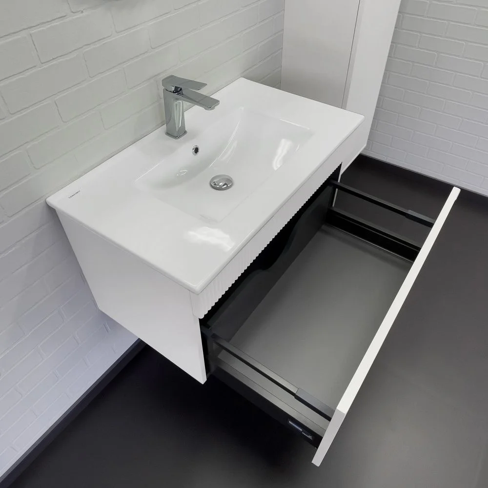 Подвесная тумба с одним большим выкатным ящиком оборудованным направляющими с системой плавного закрывания. Корпус тумбы изготовлены из влагостойкого ЛДСП. Фасад тумбы из МДФ фрезерован кантом по периметру. Подпорная царга фрезерована вертикальным узором. Корпус и фасад тумбы окрашены белой матовой эмалью. Тумба подготовлена для подключения водоснабжения снизу и сзади.