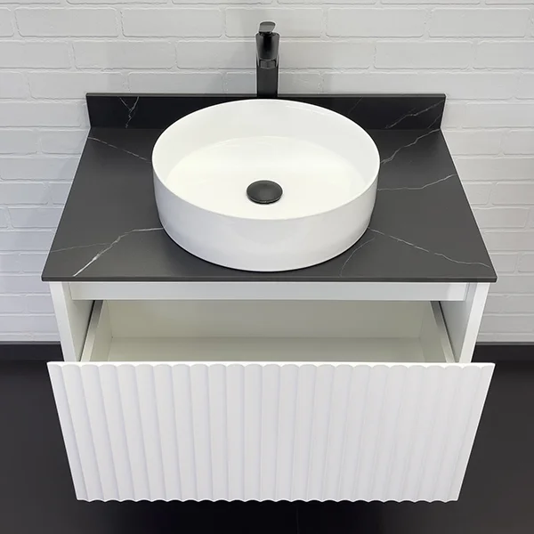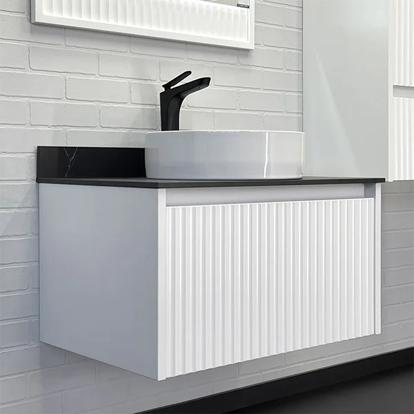 Фасад тумбы из МДФ фрезерован геометрическим узором с имитацией волны и окрашен белой матовой эмалью.