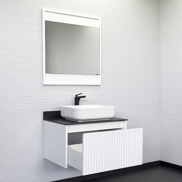 Фасад тумбы из МДФ фрезерован геометрическим узором с имитацией волны и окрашен белой матовой эмалью.
