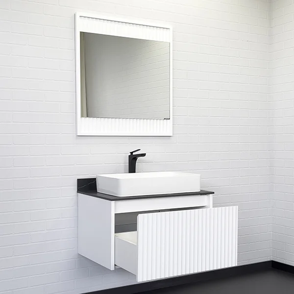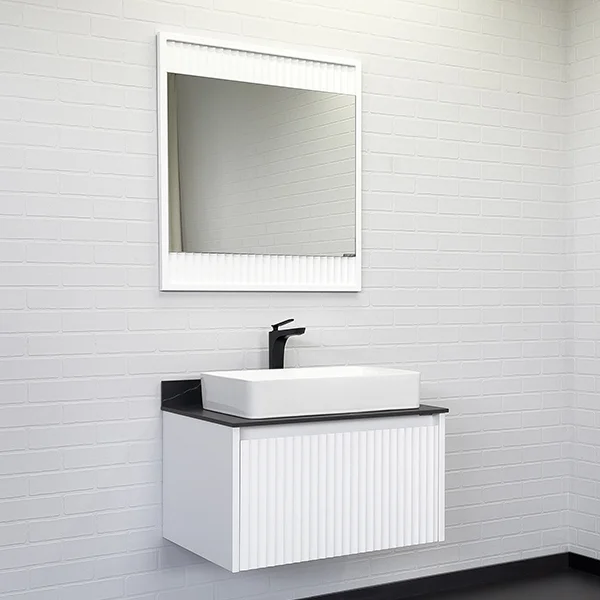 Фасад тумбы из МДФ фрезерован геометрическим узором с имитацией волны и окрашен белой матовой эмалью.