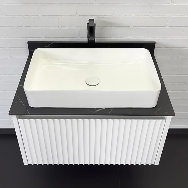 Комплектация: накладная керамическая раковина Comforty 78189, черная матовая столешница из керамогранита под мрамор Калакатта Блэк с бортиком.