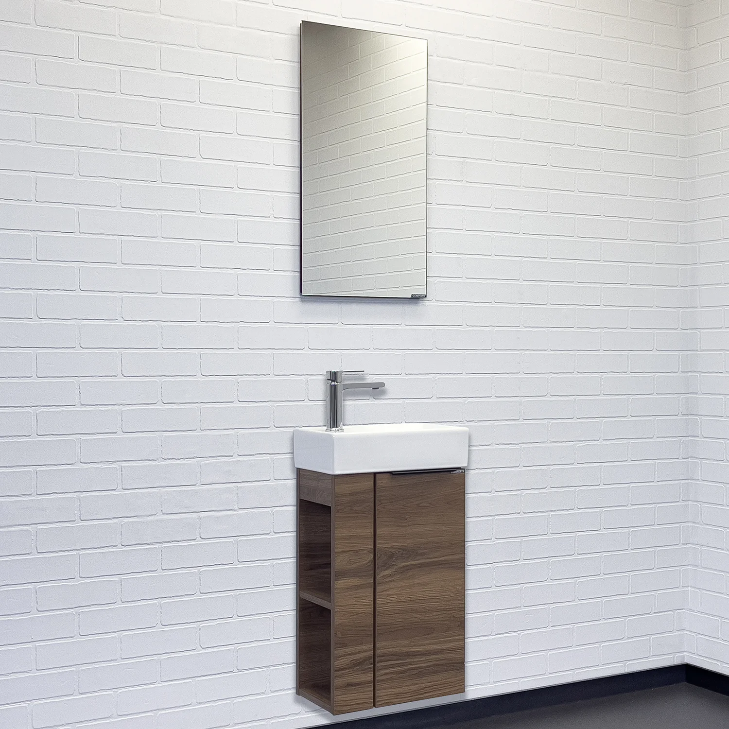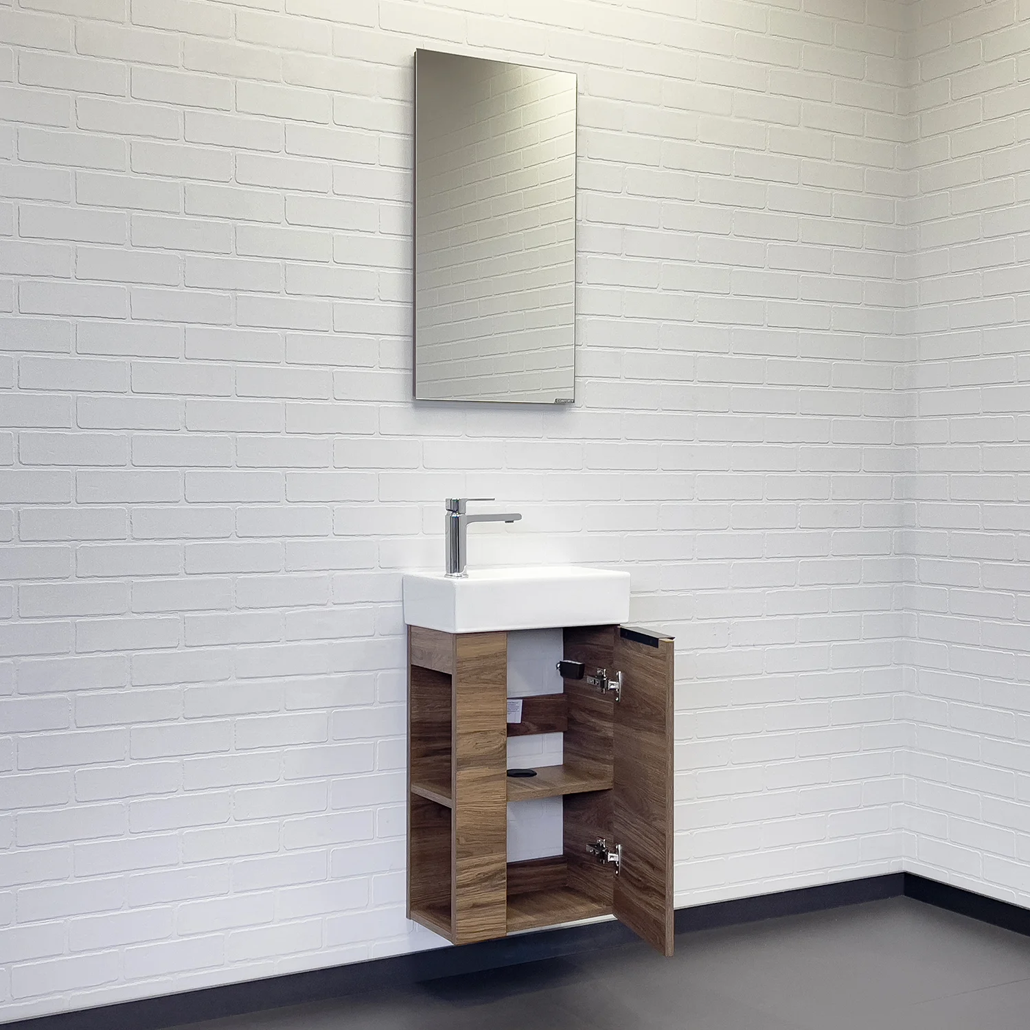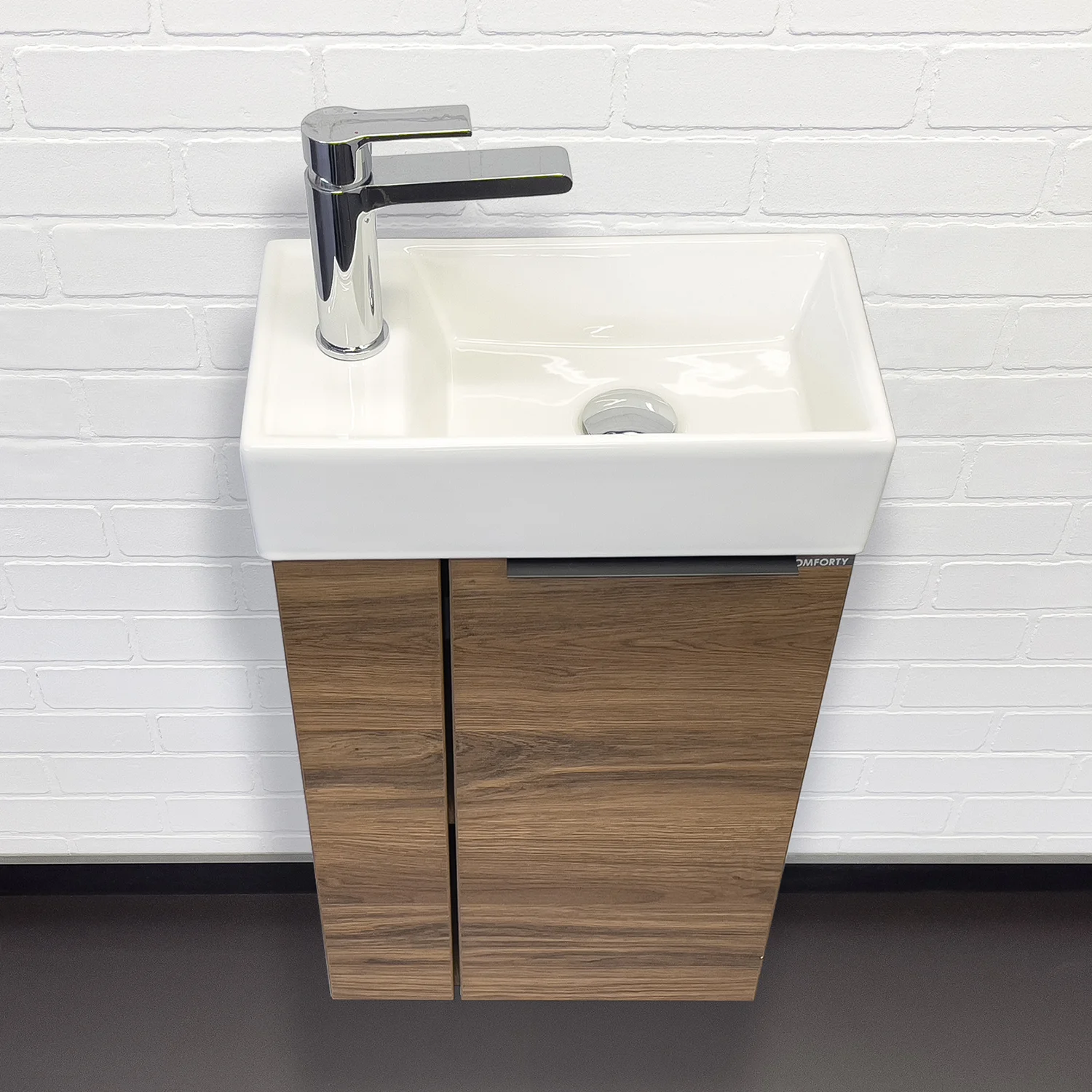 Компактная подвесная тумба-умывальник Comforty Матэ для небольших санузлов. Фасад и корпус тумбы изготовлены из влагостойкого ДСП в декоре «дуб темно-коричневый». Этот декор при прикосновении дарит ощущение натуральной древесины. В комплекте асимметричная раковина с отверстием под смеситель сбоку. Раковина глазурована со всех сторон, поэтому может быть установлена как в правом, так и в левом варианте. На левом торце тумбы - полки.