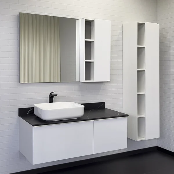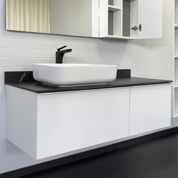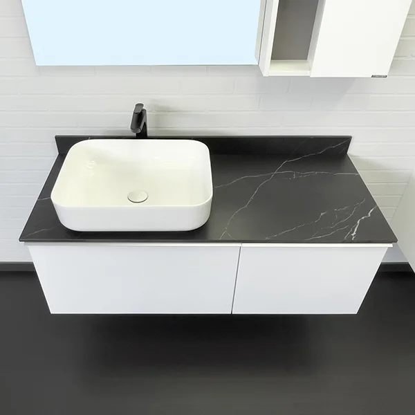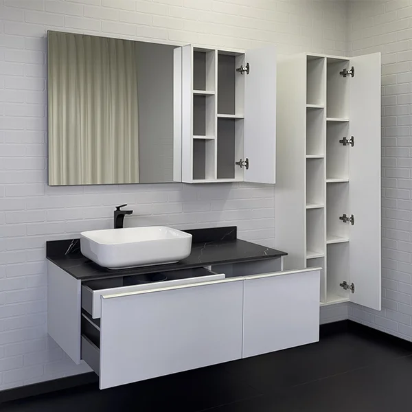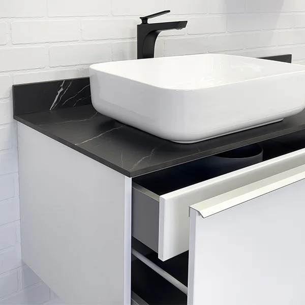 Широкая подвесная тумба-умывальник в современном стиле с двумя выкатными ящиками. Ящики оснащены системой с плавным закрыванием. За правым фасадом скрывается внутренний ящик оснащенный системой push-to-open (открытие при нажатии). Тумба укомплектована столешницей и плинтусом из керамогранита под мрамор Калакатта Блэк и накладной прямоугольной раковиной.