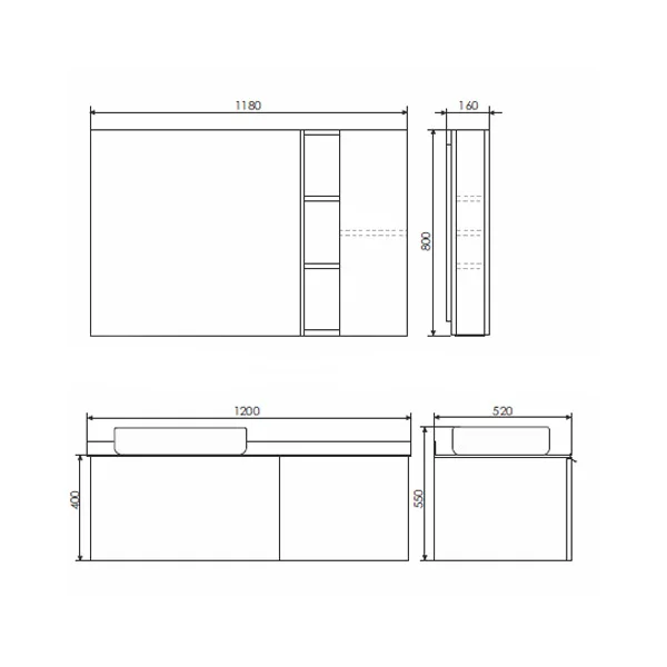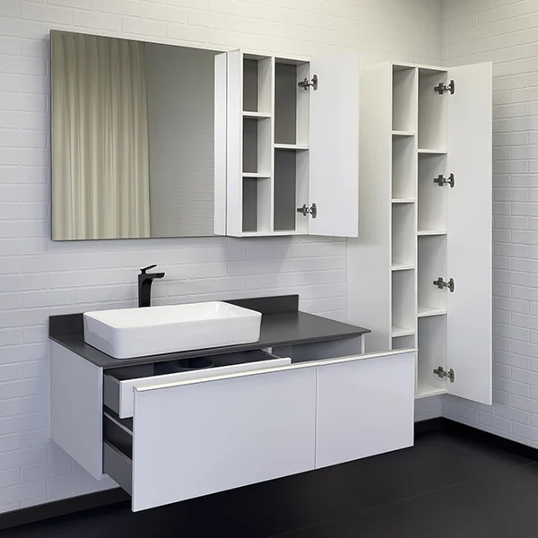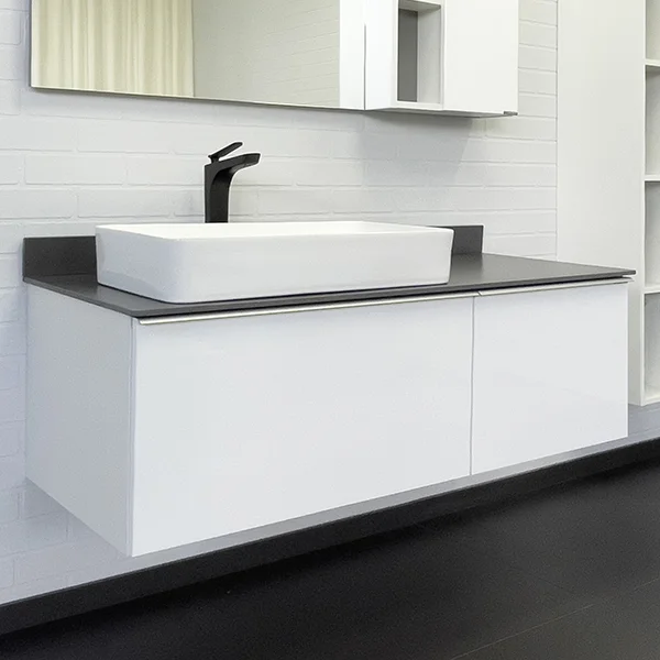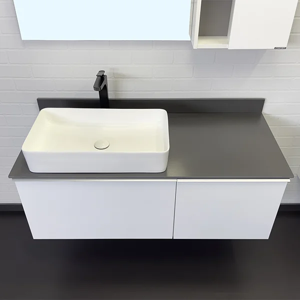 Широкая подвесная тумба-умывальник в современном стиле с двумя выкатными ящиками. Ящики оснащены системой с плавным закрыванием. За правым фасадом скрывается внутренний ящик оснащенный системой push-to-open (открытие при нажатии). Тумба укомплектована столешницей и плинтусом из керамогранита цвета графит и накладной прямоугольной раковиной 78189.