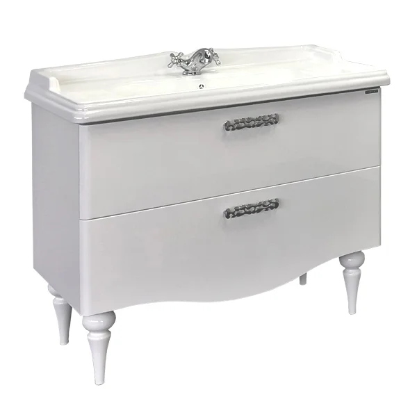 Тумба-умывальник в неоклассическом стиле с двумя широкими выкатными ящиками. Ящики оснащены системой с плавным закрыванием. Фасады тумбы покрыты белой глянцевой эмалью. Тумба укомплектована широкой и глубокой раковиной в классическом стиле с бортиком.
