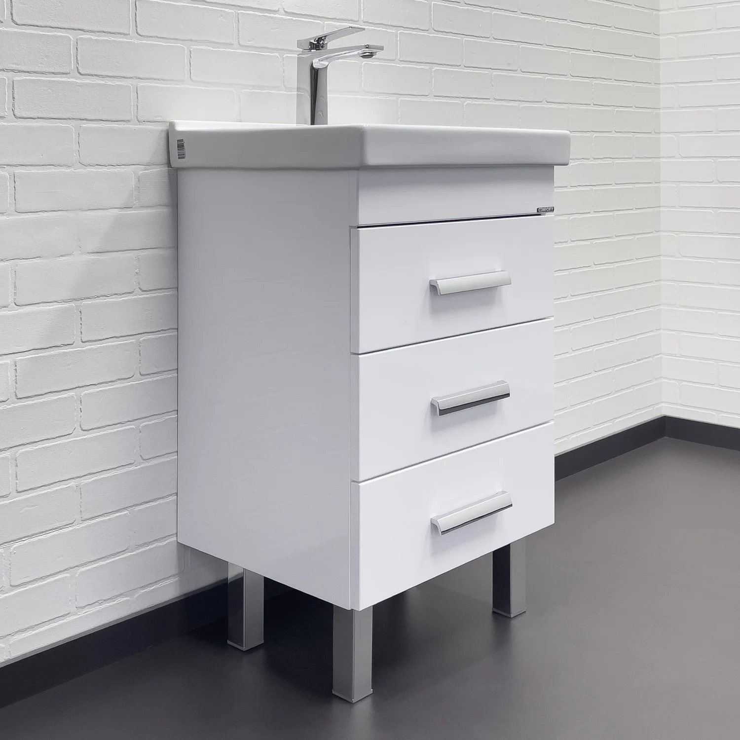 Напольная тумба с тремя выдвижными ящиками, оснащенным системой плавного закрывания. Тумба подготовлена для подключения водоснабжения снизу.