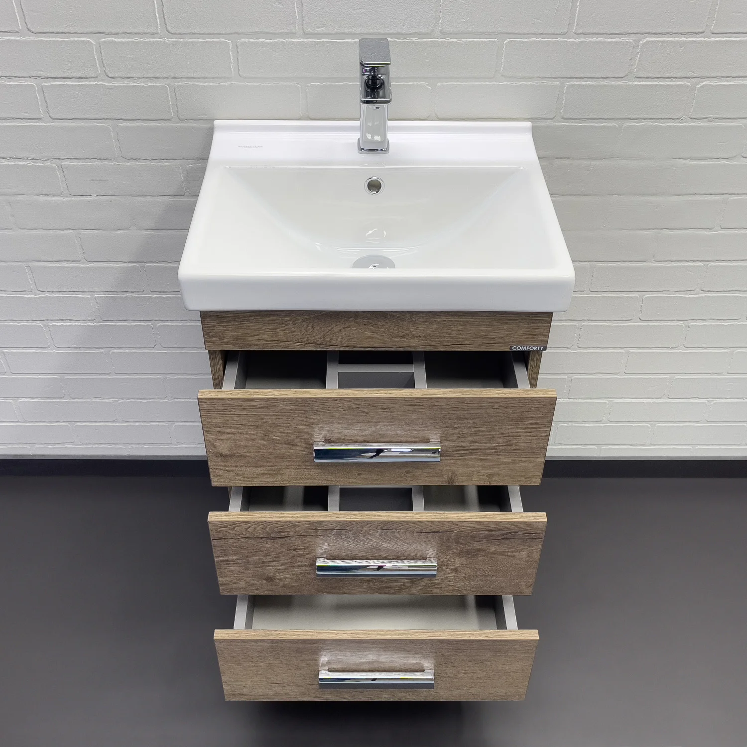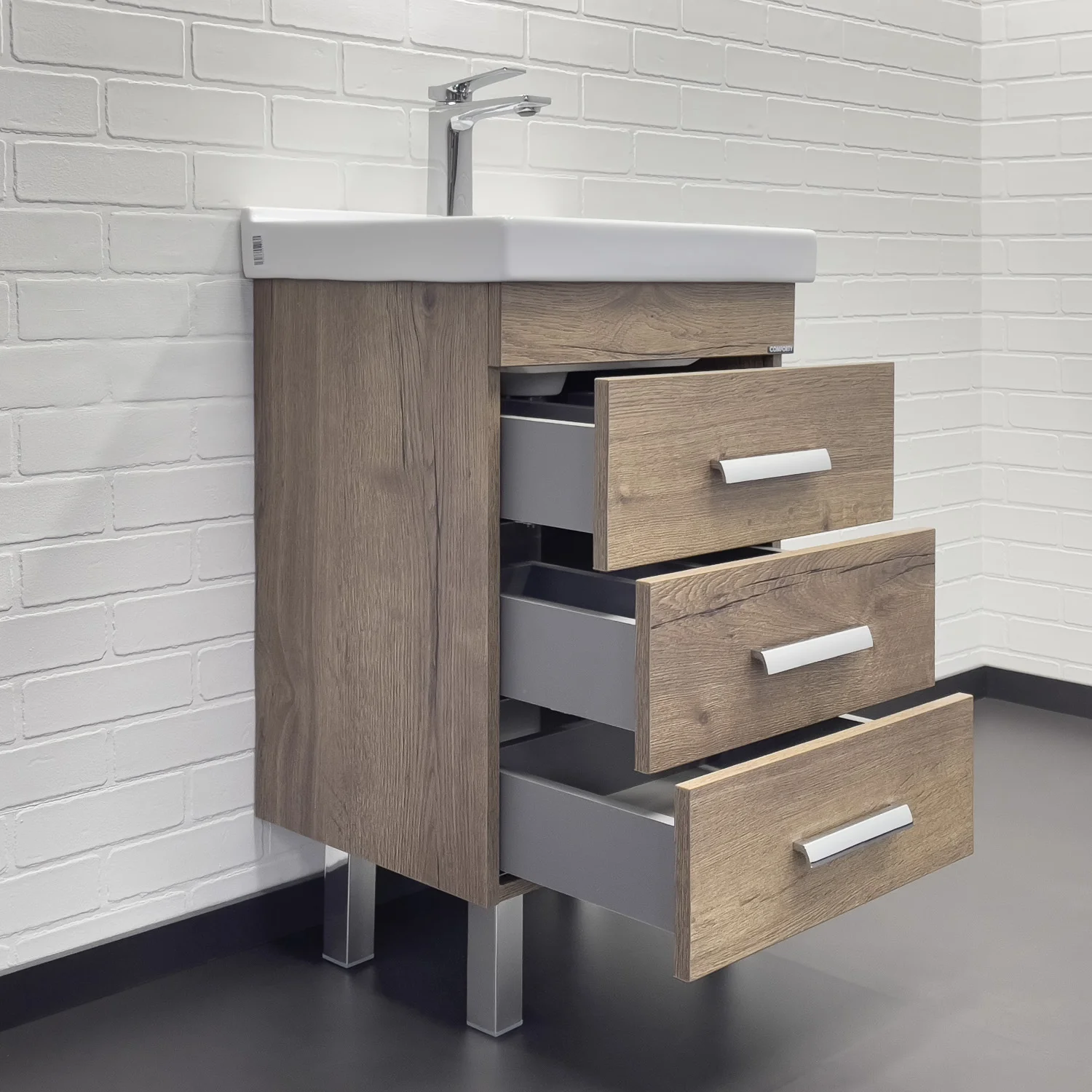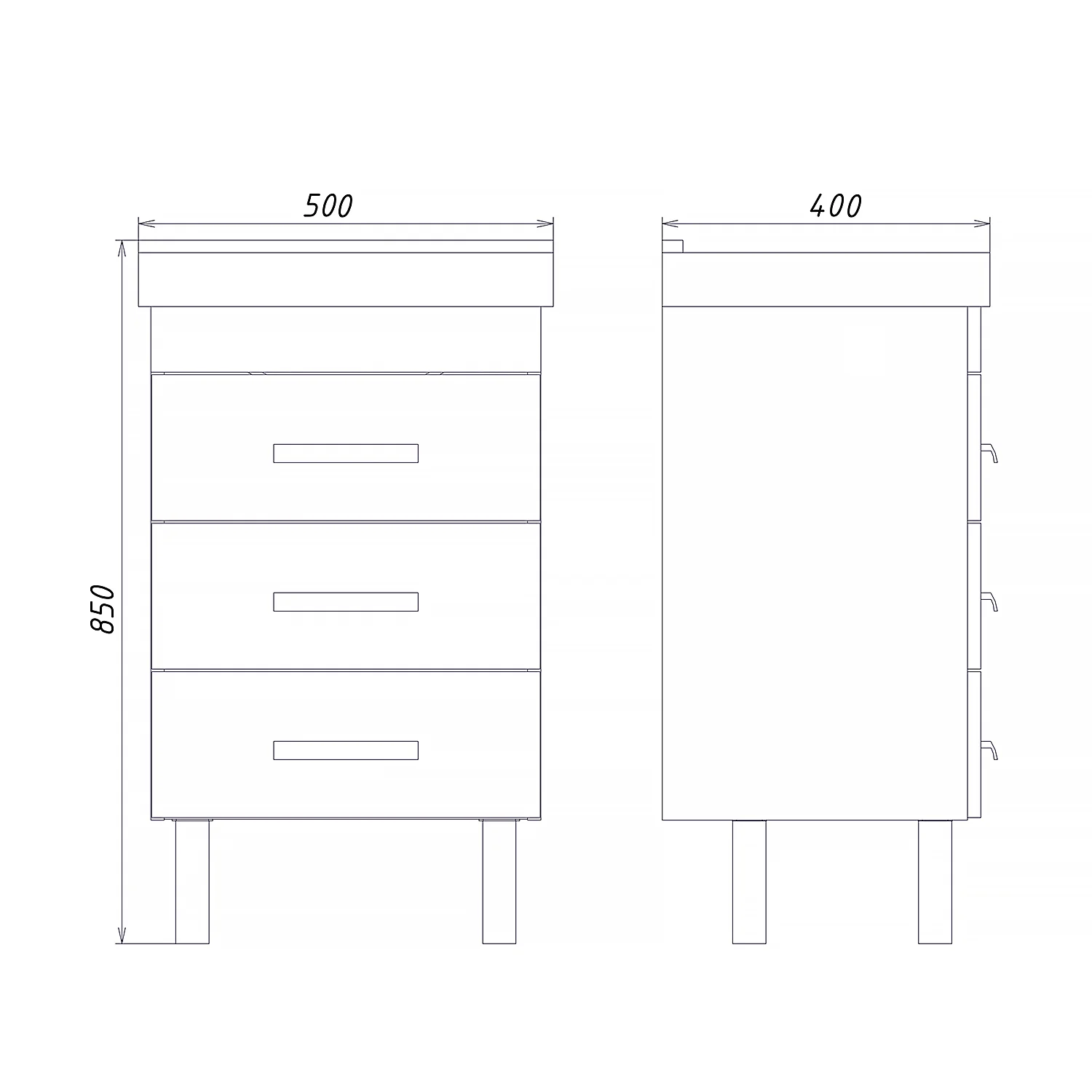 Напольная тумба с тремя выдвижными ящиками, оснащенным системой плавного закрывания. Тумба подготовлена для подключения водоснабжения снизу.