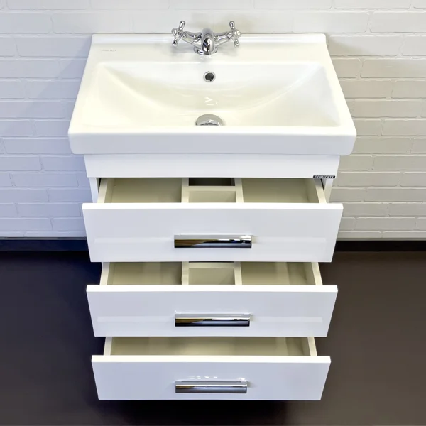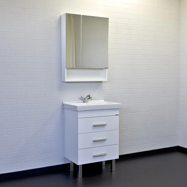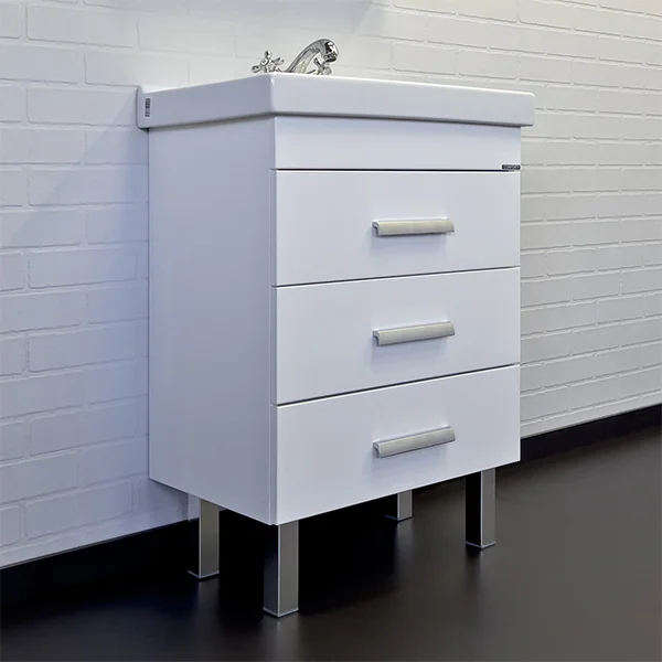 Напольная тумба с тремя выдвижными ящиками, оснащенным системой плавного закрывания и хромированными ручками. Корпус и фасады тумбы изготовлены из влагостойкого ДСП и окрашены белой глянцевой эмалью. Тумба подготовлена для подключения водоснабжения снизу.