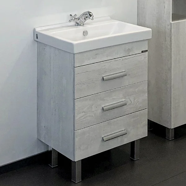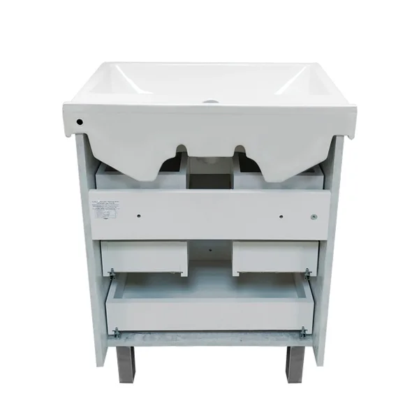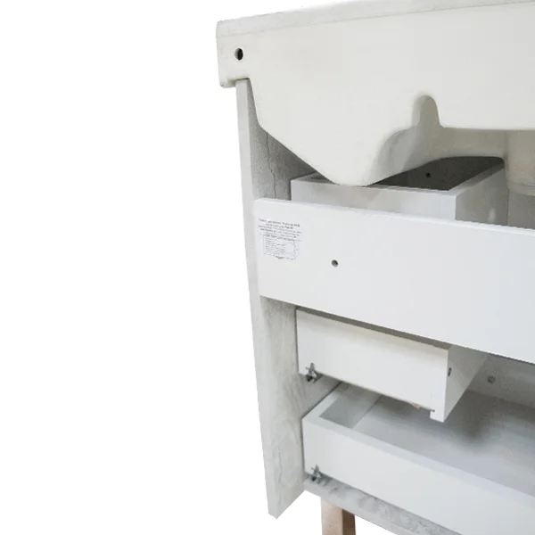 Напольная тумба с тремя выдвижными ящиками, оснащенным системой плавного закрывания. Тумба подготовлена для подключения водоснабжения снизу.