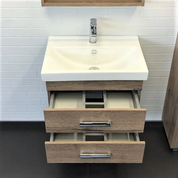 Тумба с двумя выдвижными ящиками, оснащенным системой плавного закрывания и хромированными ручками. Тумба подготовлена для подключения водоснабжения снизу. Название: Тумба-умывальник подвесная