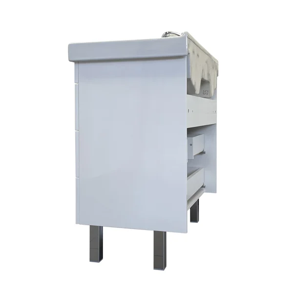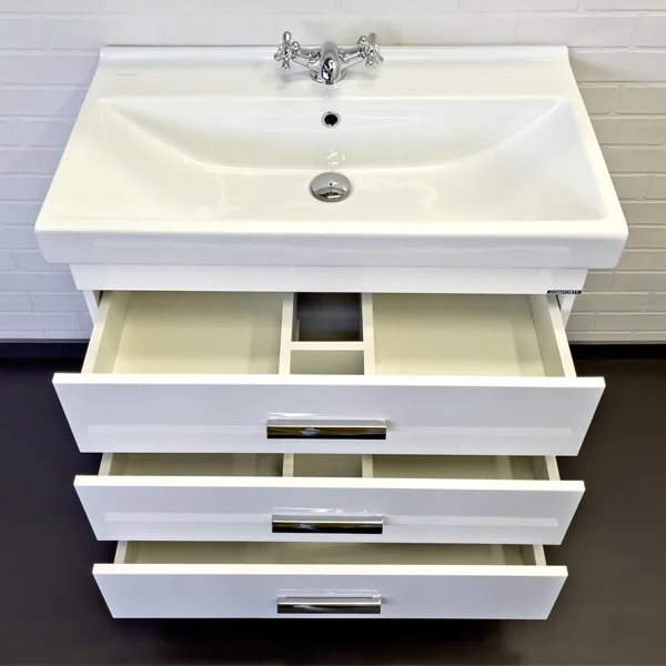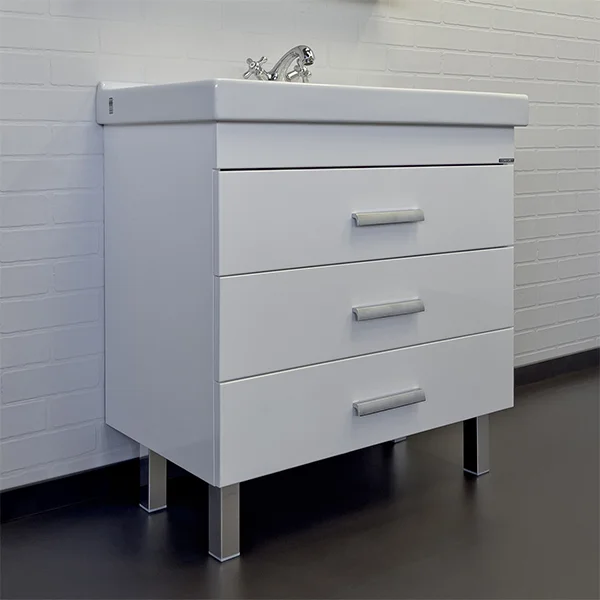 Напольная тумба-умывальник с тремя выкатными ящиками. Ящики оснащены доводчиками для плавного закрывания. Корпус и фасады тумбы из влагостойкого ДСП окрашенного белой глянцевой эмалью. Тумба укомплектована прямоугольной раковиной самарского завода из 100% санитарного фарфора.