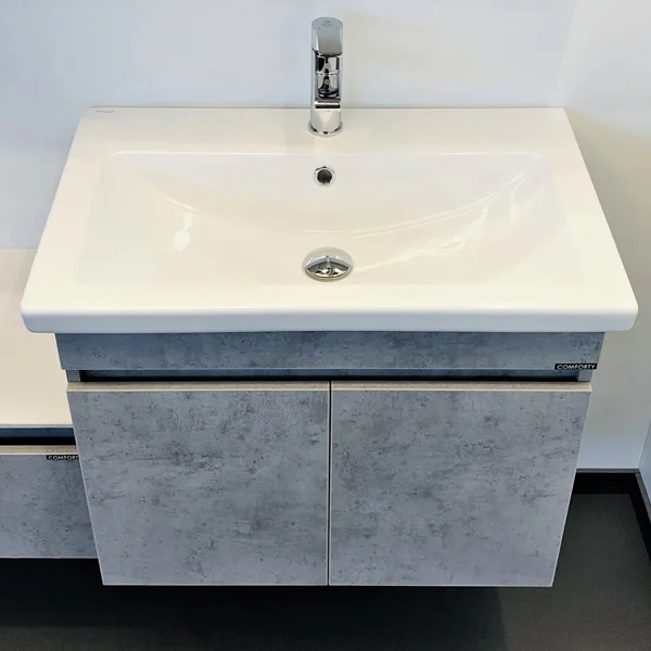 Подвесная тумба-умывальник с двумя распашными дверцами. Створки оборудованы петлями с механизмами плавного закрывания. Корпус и фасады из влагостойкого ЛДСП с декором "бетон светлый". Тумба укомплектована керамической раковиной и подготовлена к подключению коммуникаций из стены и из пола.