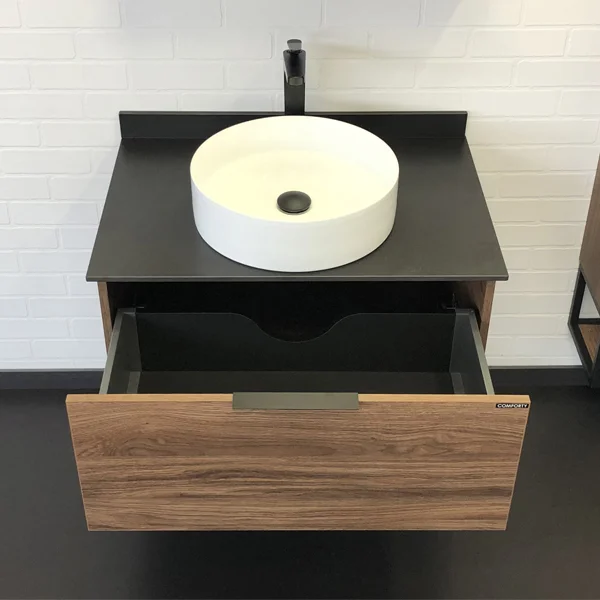 Комплектация: накладная круглая раковина Comforty 9110, столешница и пристенный бортик из черного керамогранита. Тумба подготовлена для подключения водоснабжения снизу.