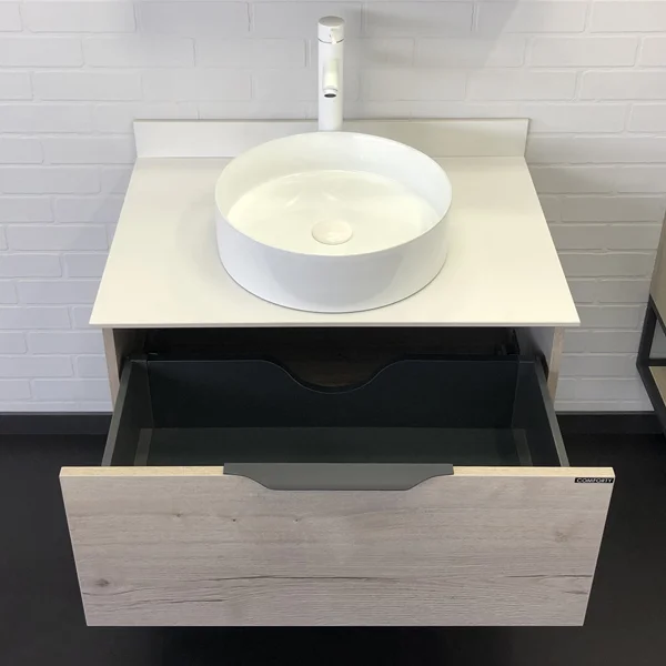 Комплектация: накладная круглая раковина Comforty 9110, столешница и пристенный бортик из белого керамогранита. Тумба подготовлена для подключения водоснабжения снизу.