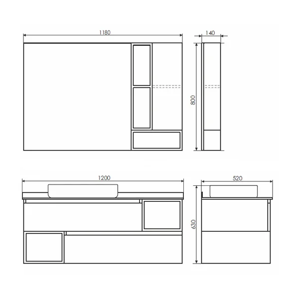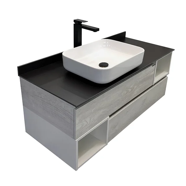 Широкая подвесная тумба-умывальник в современном стиле с двумя широкими выкатными ящиками и пространствами для открытого хранения. Ящики оснащены направляющими с системой плавного закрывания. Тумба укомплектована столешницей и плинтусом из керамогранита цвета графит и накладной прямоугольной раковиной.