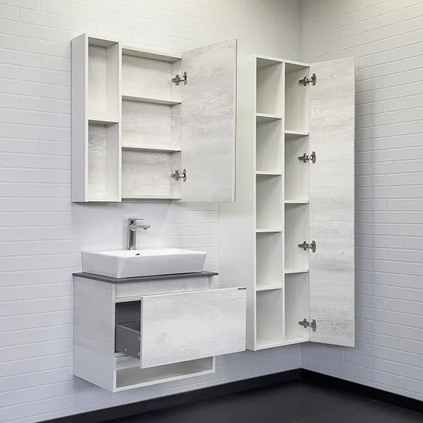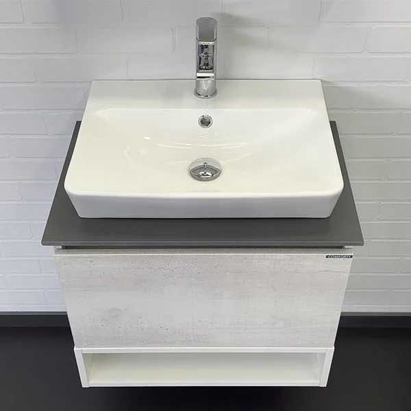 Тумба-умывальник в современном стиле выдвижным ящиком и пространством для открытого хранения. Ящик оснащен направляющими с системой плавного закрывания. Тумба укомплектована столешницей и бортиком из керамогранита цвета графит и накладной прямоугольной раковиной.