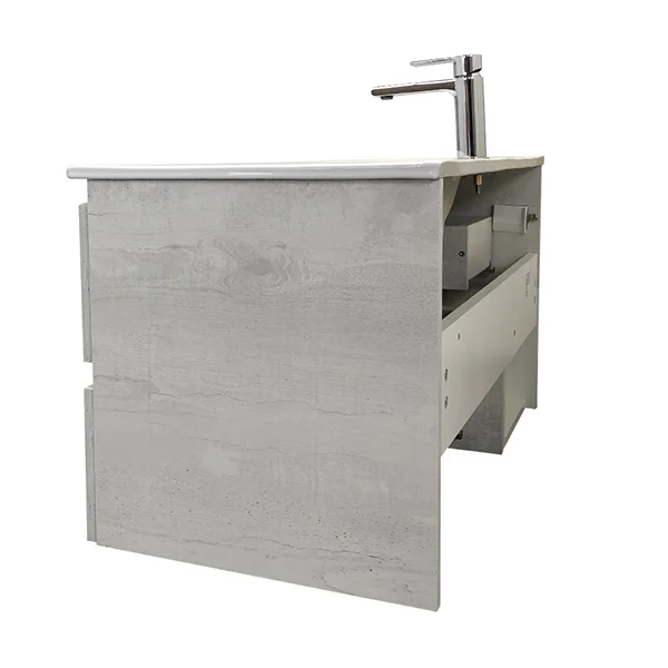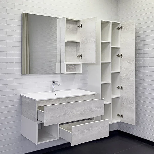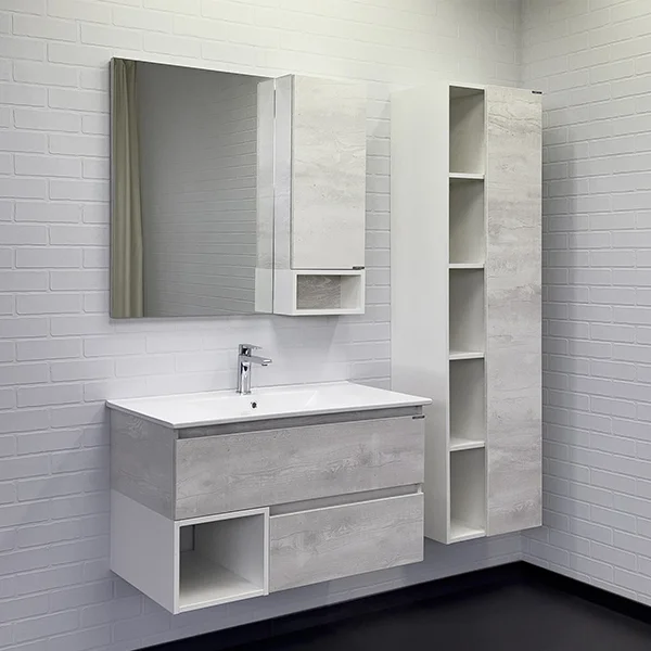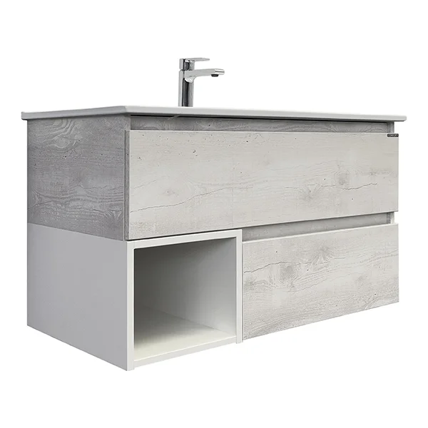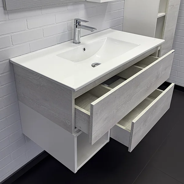 Тумба-умывальник в современном стиле с двумя широкими выкатными ящиками и пространством для открытого хранения. Ящики оснащены системой с плавным закрыванием. Тумба укомплектована накладной прямоугольной раковиной из санфарфора