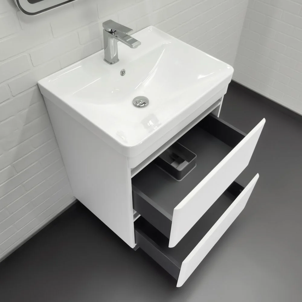 Напольная тумба с двумя выдвижными ящиками. Направляющие ящиков оборудованы системой плавного закрывания. Лицевая фурнитура на фасаде отсутствует, для открытия ящика нужно потянуть верхний край фасада, на котором сделан вырез под естественный хват. Прорези в фасаде декорированы алюминиевым профилем. Ящики выполнены из ВЛДСП контрастного цвета "серый уголь". Тумба подготовлена для подключению коммуникаций снизу и сзади.