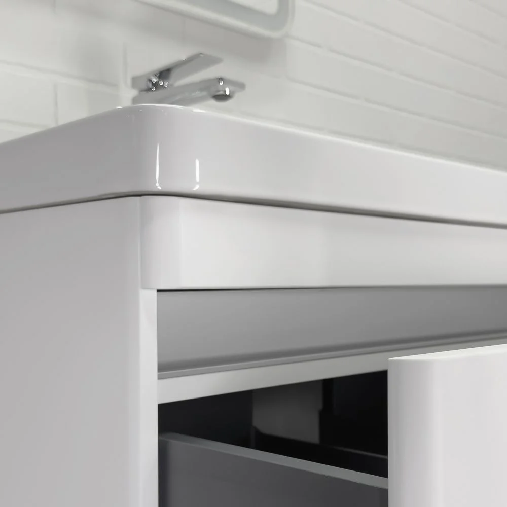Корпус и фасад тумбы из МДФ окрашен белой матовой эмалью.