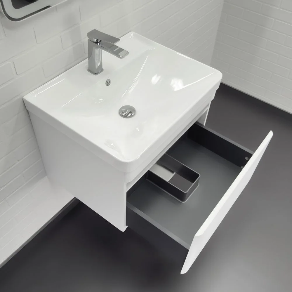 Подвесная тумба с одним выдвижным ящиком. Направляющие ящика оборудованы системой плавного закрывания. Лицевая фурнитура на фасаде отсутствует, для открытия ящика нужно потянуть верхний край фасада, на котором сделан вырез под естественный хват. Прорезь в фасаде декорирована алюминиевым профилем. Ящик выполнен из ВЛДСП контрастного цвета "серый уголь". Тумба подготовлена для подключению коммуникаций снизу и сзади.