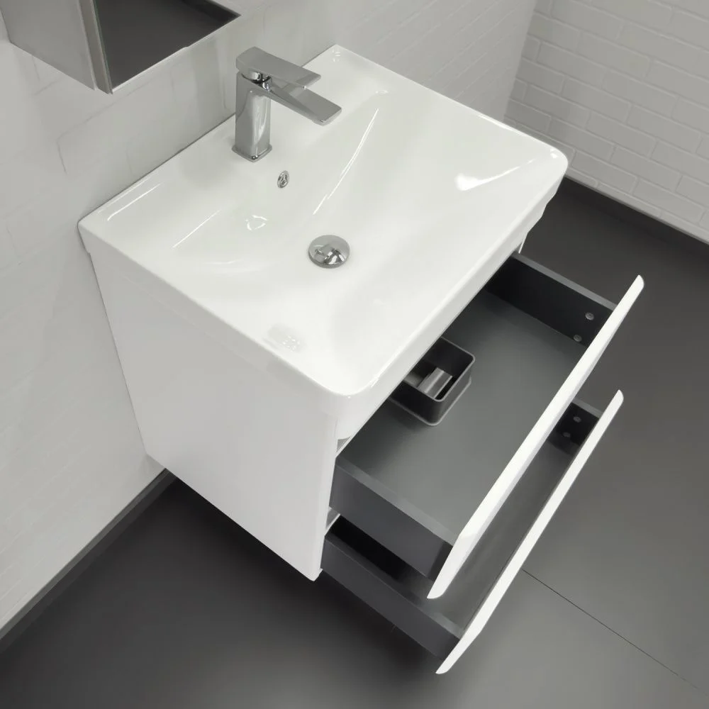 Подвесная тумба с двумя выдвижными ящиками. Направляющие ящиков оборудованы системой плавного закрывания. Лицевая фурнитура на фасадах отсутствует, для открытия ящиков нужно потянуть верхний край фасада, на котором сделан вырез под естественный хват. Прорези в фасадах декорированы алюминиевым профилем. Ящики выполнены из ВЛДСП контрастного цвета "серый уголь". Тумба подготовлена для подключению коммуникаций снизу и сзади.