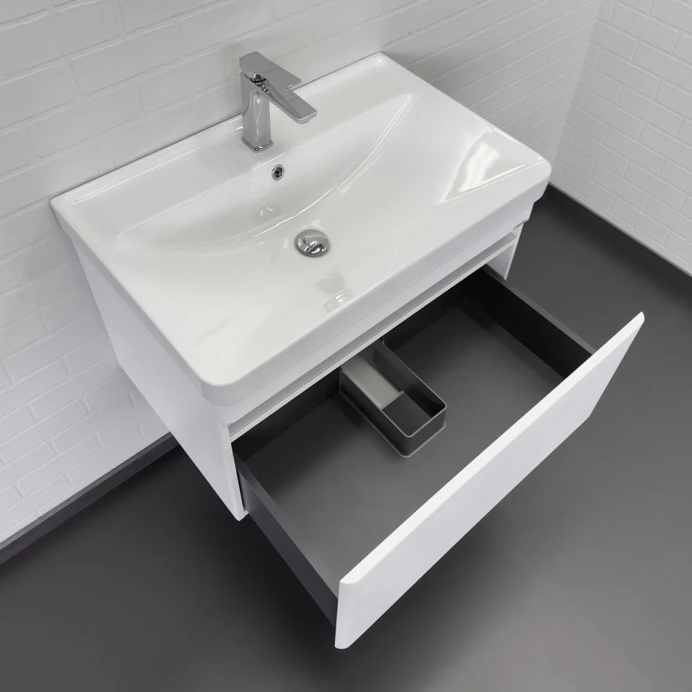 Подвесная тумба шириной 70 см с одним выдвижным ящиком. Направляющие ящика оборудованы системой плавного закрывания. Лицевая фурнитура на фасаде отсутствует, для открытия ящика нужно потянуть верхний край фасада, на котором сделан вырез под естественный хват. Прорезь в фасаде декорирована алюминиевым профилем. Ящик выполнен из ВЛДСП контрастного цвета "серый уголь". Тумба подготовлена для подключению коммуникаций снизу и сзади.