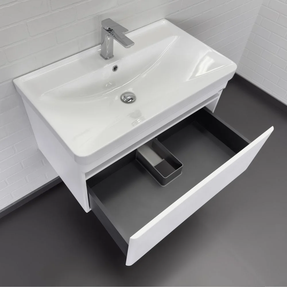 Подвесная тумба с одним большим выдвижным ящиком. Направляющие ящика оборудованы системой плавного закрывания. Лицевая фурнитура на фасаде отсутствует, для открытия ящика нужно потянуть верхний край фасада, на котором сделан вырез под естественный хват. Прорезь в фасаде декорирована алюминиевым профилем. Ящик выполнен из ВЛДСП контрастного цвета серый уголь. Тумба подготовлена для подключению коммуникаций снизу и сзади.