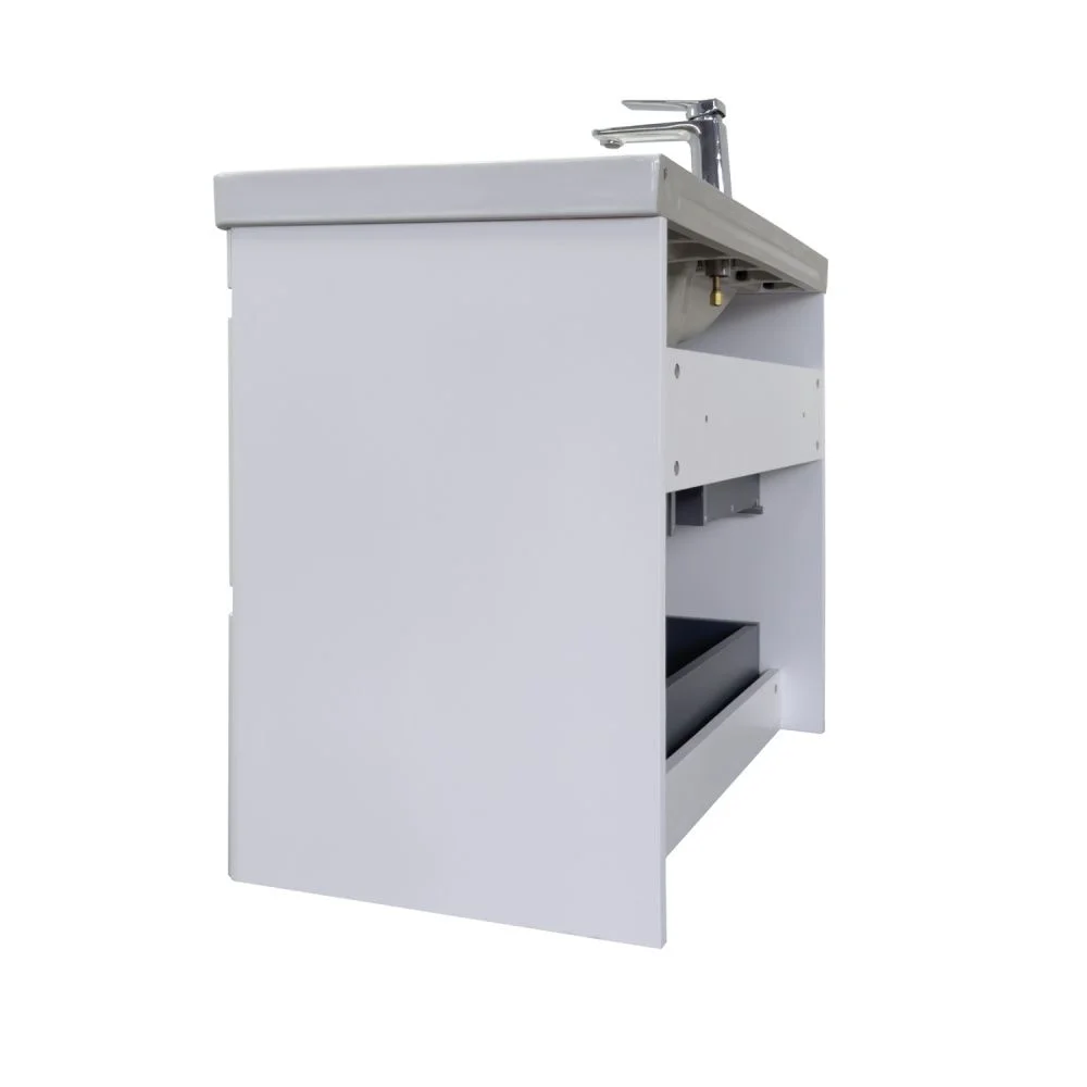 Подвесная тумба с двумя большими выдвижными ящиками. Направляющие ящиков оборудованы системой плавного закрывания. Лицевая фурнитура на фасадах отсутствует, для открытия ящиков нужно потянуть верхний край фасада, на котором сделан вырез под естественный хват. Прорези в фасадах декорированы алюминиевым профилем. Ящики выполнены из ВЛДСП контрастного цвета серый уголь. Тумба подготовлена для подключению коммуникаций снизу и сзади.