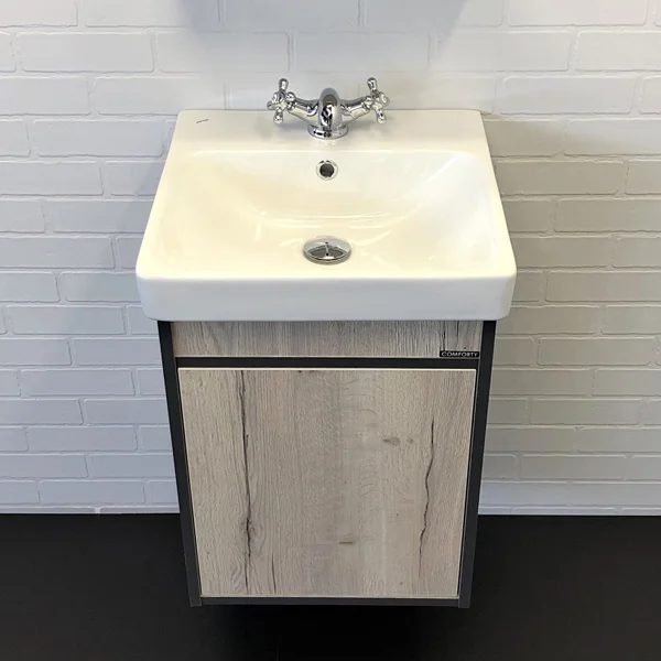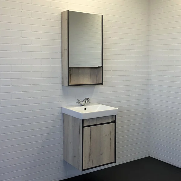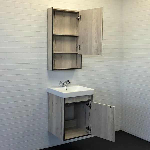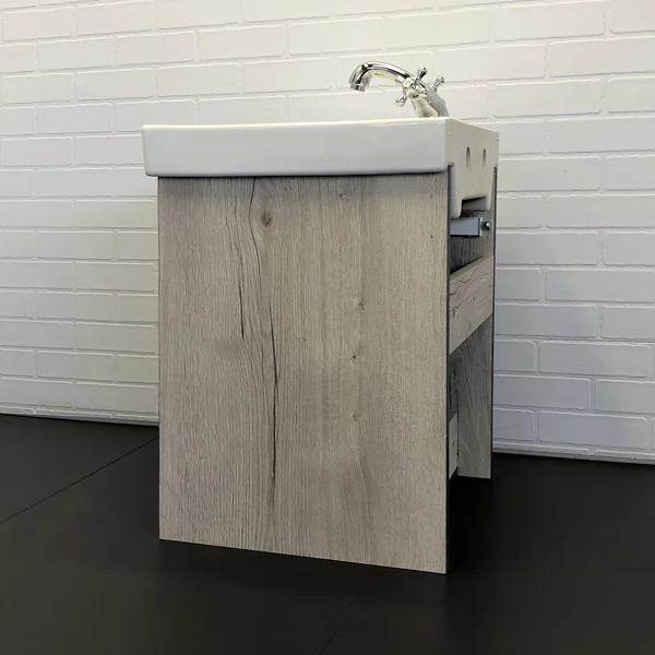 Компактная тумба-умывальник в современном стиле с распашной створкой. Створка оснащена системой push-to-open открытие при нажатии. Тумба укомплектована накладной прямоугольной раковиной из санфарфора.