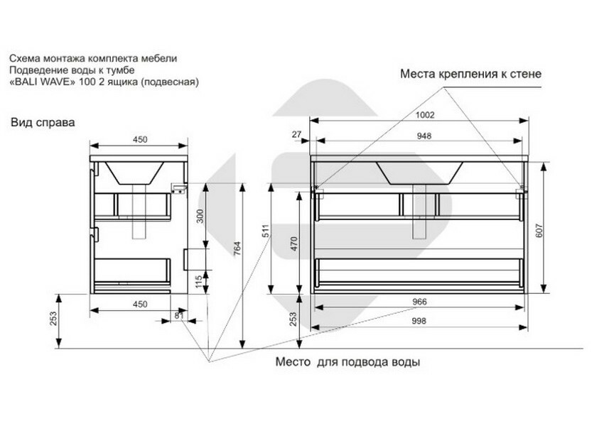 Тумба с раковиной Эстет Bali Wave 105 ФР-00018132 1000х450 подвесная 2 ящика