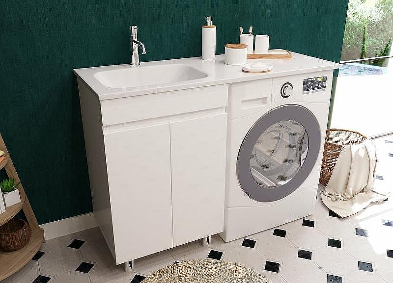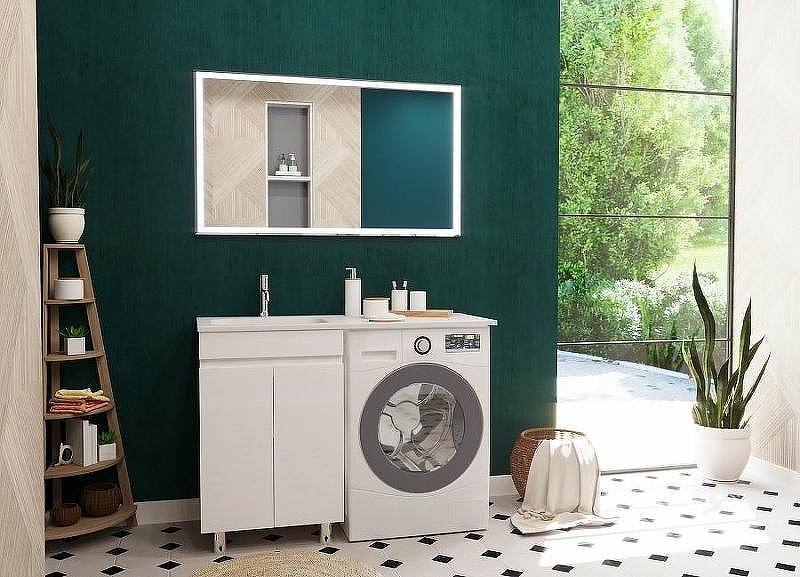 Тумба укомплектована раковиной из литьевого мрамора c глубокой чашей, плавными изгибами и вкладышем для слива. Раковина с большой столешницей удобная и функциональная. В тумбе 2 распашных дверцы со скрытыми ручками и полкой внутри, что делает использование максимально комфортным. Стиральная машина устанавливается под столешницей, за счет чего экономит место в ванной комнате.