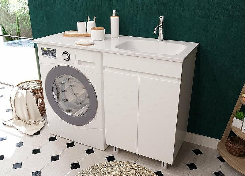 Тумба укомплектована раковиной из литьевого мрамора c глубокой чашей, плавными изгибами и вкладышем для слива. Раковина с большой столешницей удобная и функциональная. В тумбе 2 распашных дверцы со скрытыми ручками и полкой внутри, что делает использование максимально комфортным. Стиральная машина устанавливается под столешницей, за счет чего экономит место в ванной комнате.