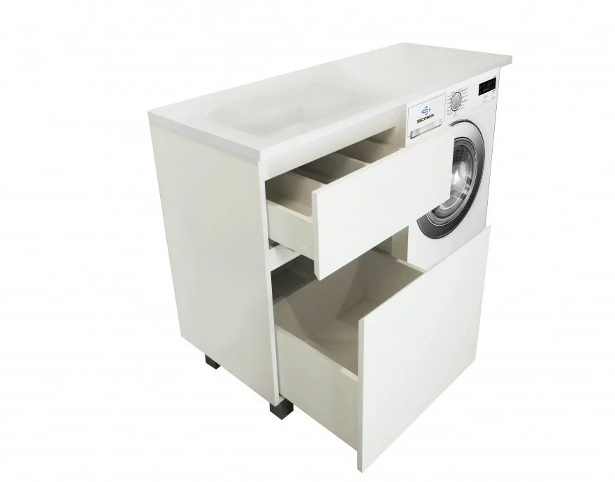 Коллекция мебели для ванной комнаты Dallas Luxe покоряет своей удивительной простой и функциональностью. Стильная лаконичная тумба, укомплектована раковиной из литьевого мрамора с удобной чашей. Стиральная машина устанавливается под столешницей, за счет чего экономит место в ванной комнате. В тумбе имеются два ящика. Нижний ящик тумбы – широкий и вместительный – предназначен для крупных предметов, а в верхнем имеется специальная организация пространства, позволяющая хранить мелкие вещи.