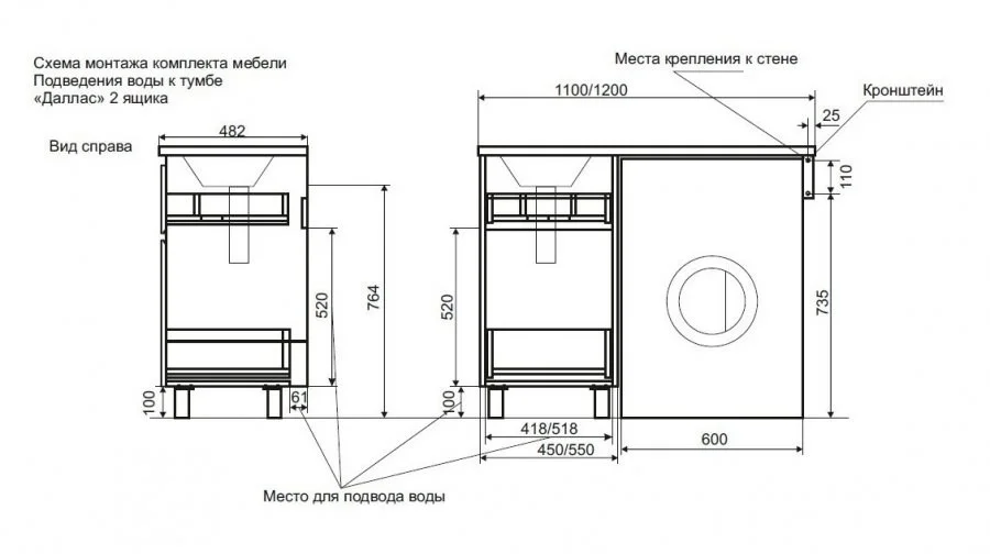 Тумба с раковиной Эстет Dallas Luxe ФР-00001966 1100х482 правая, напольная 2 ящика