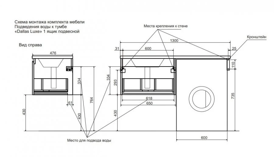 Тумба с раковиной Эстет Dallas Luxe ФР-00002421 1300х482 правая, подвесная 1 ящик