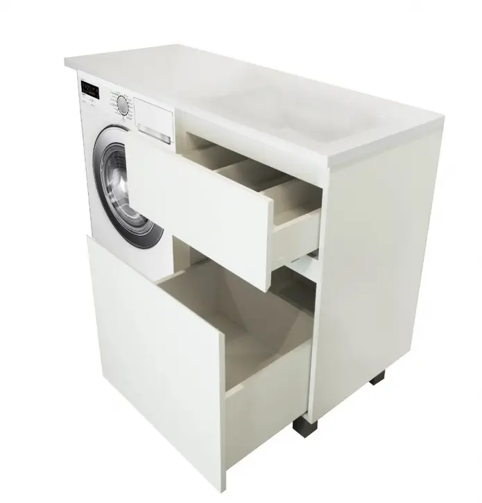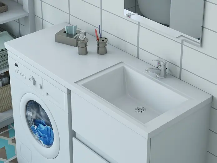 Коллекция мебели для ванной комнаты Dallas Luxe покоряет своей удивительной простой и функциональностью. Стильная лаконичная тумба, укомплектована раковиной из литьевого мрамора с удобной чашей. Стиральная машина устанавливается под столешницей, за счет чего экономит место в ванной комнате. В тумбе имеются два ящика. Нижний ящик тумбы – широкий и вместительный – предназначен для крупных предметов, а в верхнем имеется специальная организация пространства, позволяющая хранить мелкие вещи.