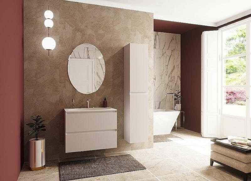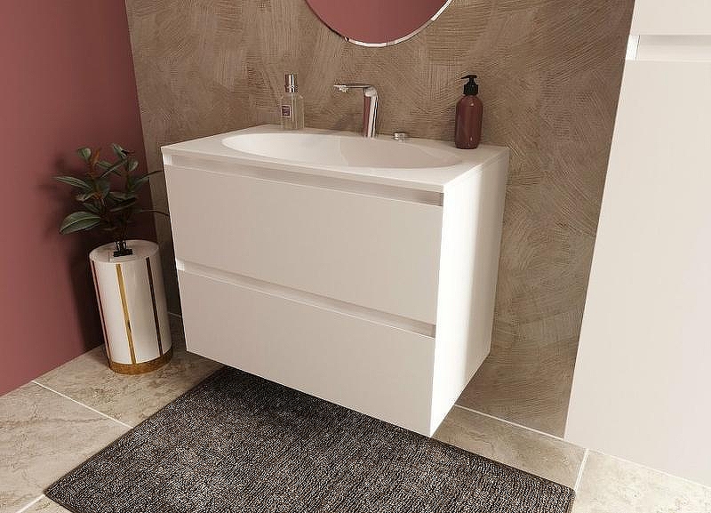 Подвесная тумба укомплектована прямоугольной раковиной из литьевого мрамора, плавно перетекающая в овальную чашу, которая добавляет изящность мебели и передает атмосферу стиля. В тумбе расположены 2 вместительных ящика, интегрированные ручки выполнены за счет скошенных фасадов. Мебель выполнена из влагостойкого ЛДСП и качественного MDF с использованием эмали RENNER (Италия). Ящики снабжены системой плавного закрывания. Для мебели используется фурнитура Samet (Турция).