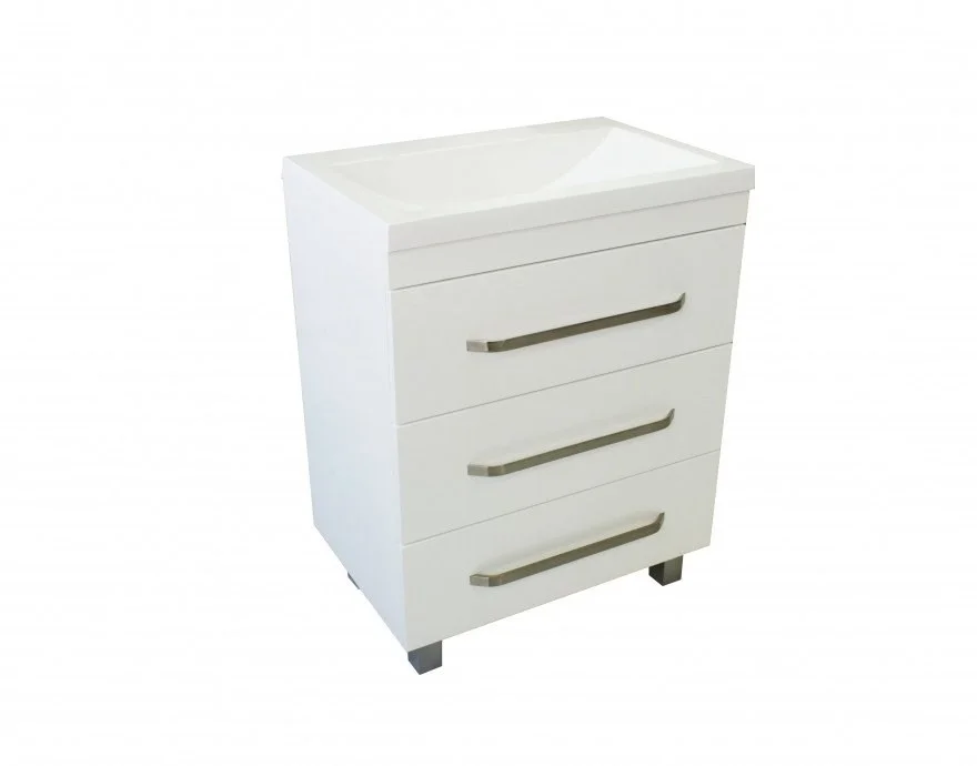 Серия Monaco выполнена в стиле хай-тек. Минимализма и четкости форм в ванной комнате поможет добиться именно этот стиль. Линии простые, строгие, жесткие. Тумба имеет три выдвижных ящика и удобные хромированные ручки.