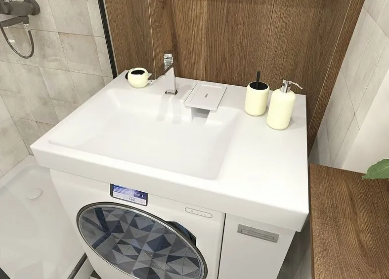 Простые и четкие линии тумбы идеально впишутся в интерьер в стиле «минимализм», а компактная раковина из литьевого мрамора установленная над стиральной машиной, позволяет сэкономить место в ванной комнате.