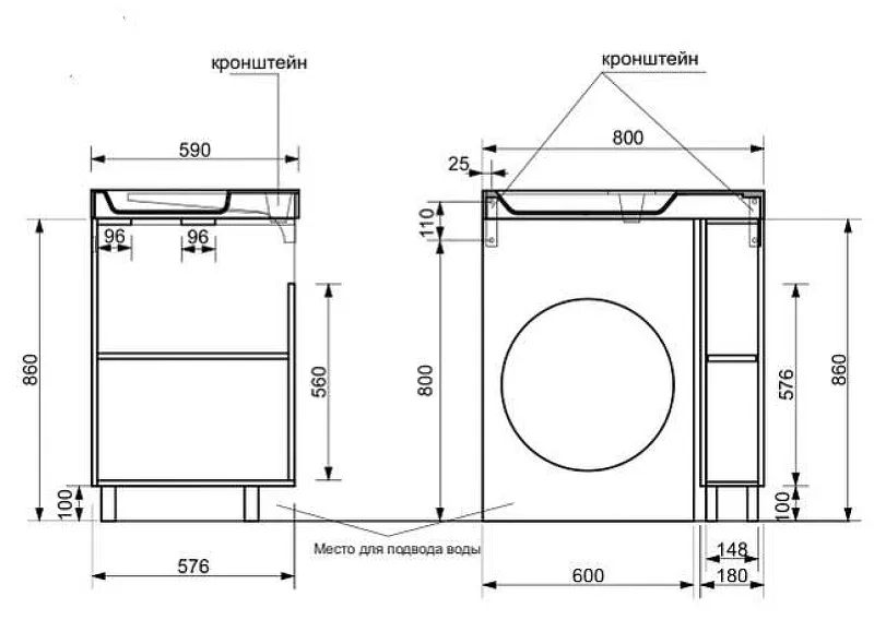 Раковина комплектуется тумбами на выбор - модуль с выдвижным ящиком (бутылочницей), либо модуль с полкой и распашной дверцей. На фасаде распложена врезная ручка, цвет «хром».