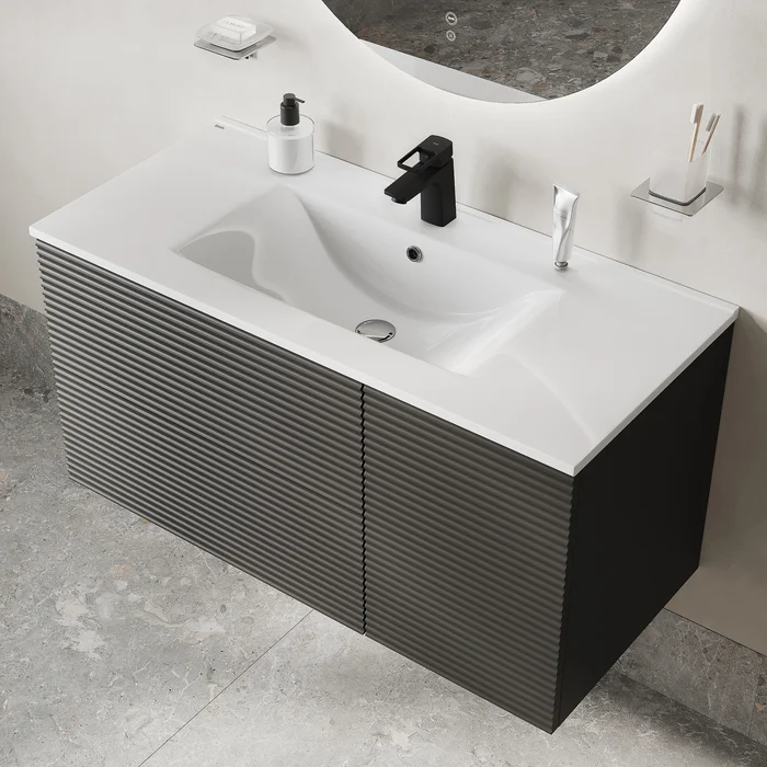 Вместительная подвесная тумба для ванной комнаты Bild с умывальником и выдвижными ящиками и полками – красивый дизайн с трендовой горизонтальной фрезеровкой в сочетании с популярным темно-серым цветом, удобством и практичностью.