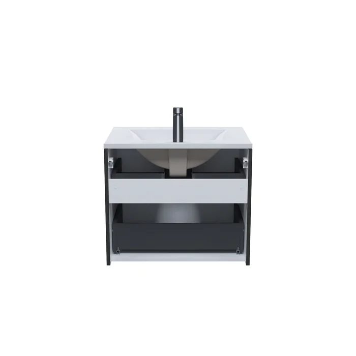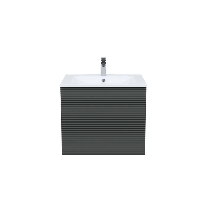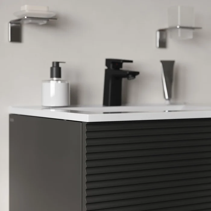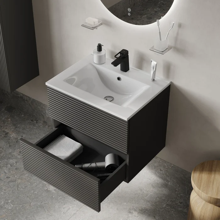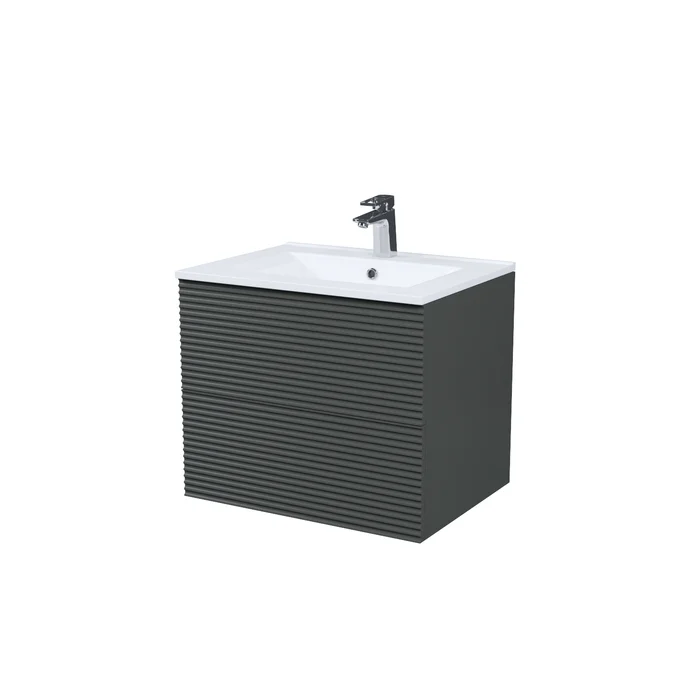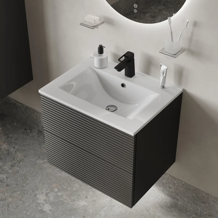 Компактная подвесная тумба для ванной комнаты Bild с умывальником и выдвижными ящиками – красивый дизайн с трендовой горизонтальной фрезеровкой в сочетании в сочетании с популярным темно-серым цветом, удобством и практичностью.