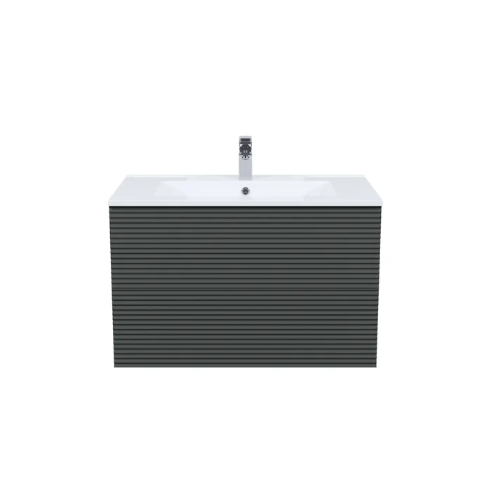Вместительная подвесная тумба для ванной комнаты Bild с умывальником и выдвижными ящиками – красивый дизайн с трендовой горизонтальной фрезеровкой в сочетании с популярным темно-серым цветом, удобством и практичностью.