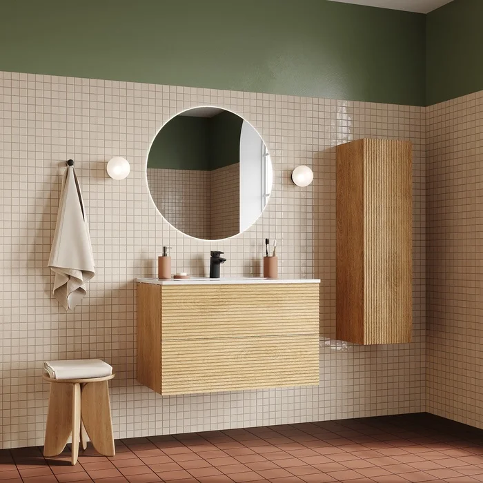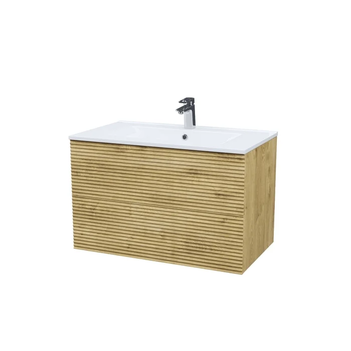 Вместительная подвесная тумба для ванной комнаты Bild с умывальником и ящиками – красивый дизайн со структурной горизонтальной фрезеровкой в сочетании с теплым оттенком дуба, удобством и практичностью.