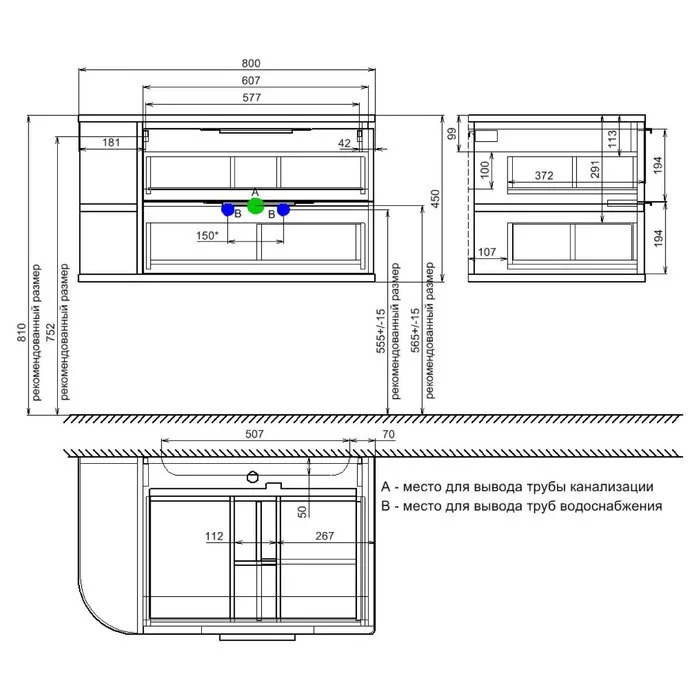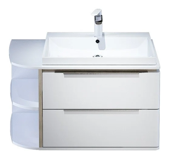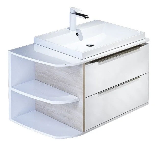 Тумба с умывальником для ванной комнаты, подвесная. Размеры тумбы без умывальника: 479х800х450 мм (ДхШхВ). Размеры умывальника: 450х600 мм (ДхШ). Фасад МДФ 16мм в эмали, боковины ЛДСП белый глянец/под дерево. Два выдвижных ящика с механизмом плавного доведения, 2 открытые закругленные полки.