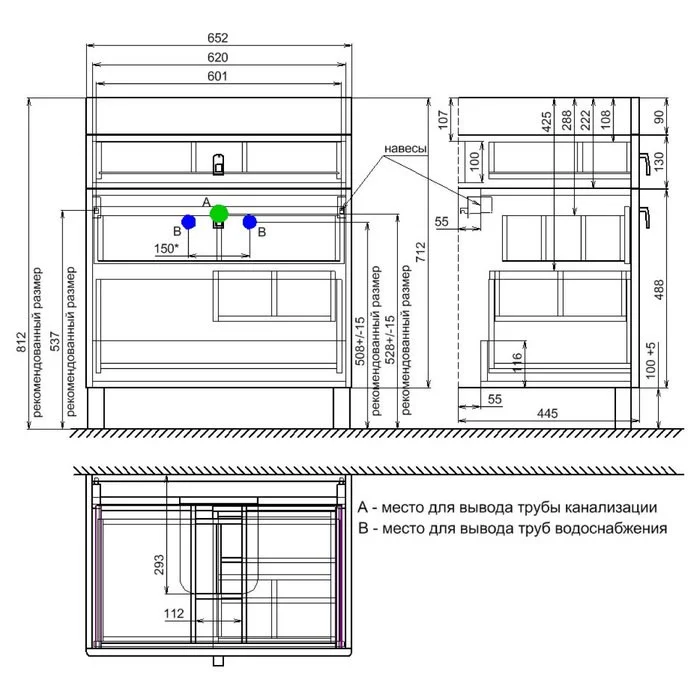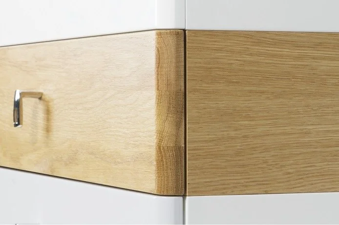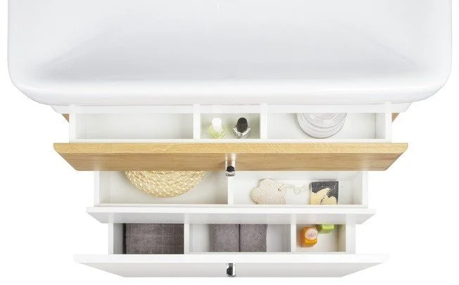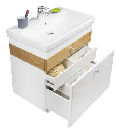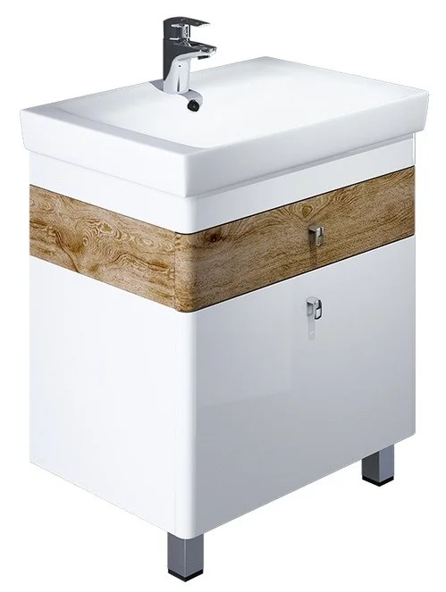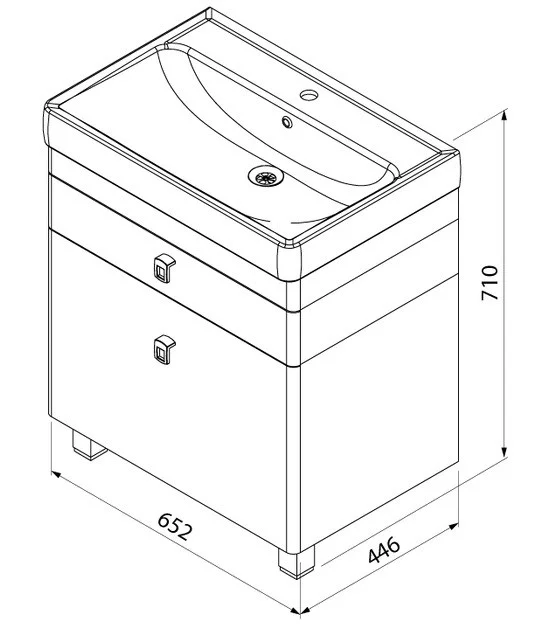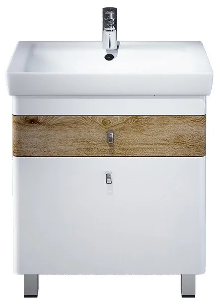 Тумба с умывальником для ванной комнаты, напольная. Размеры тумбы без умывальника: 446х652х710 мм (ДхШхВ). Размеры умывальника: 476х704 мм (ДхШ). Фасад МДФ 16мм в эмали, боковины ЛДСП белый глянец/под дерево. Две дверцы, один выдвижной ящик с механизмом плавного доведения. Петли с доводчиком