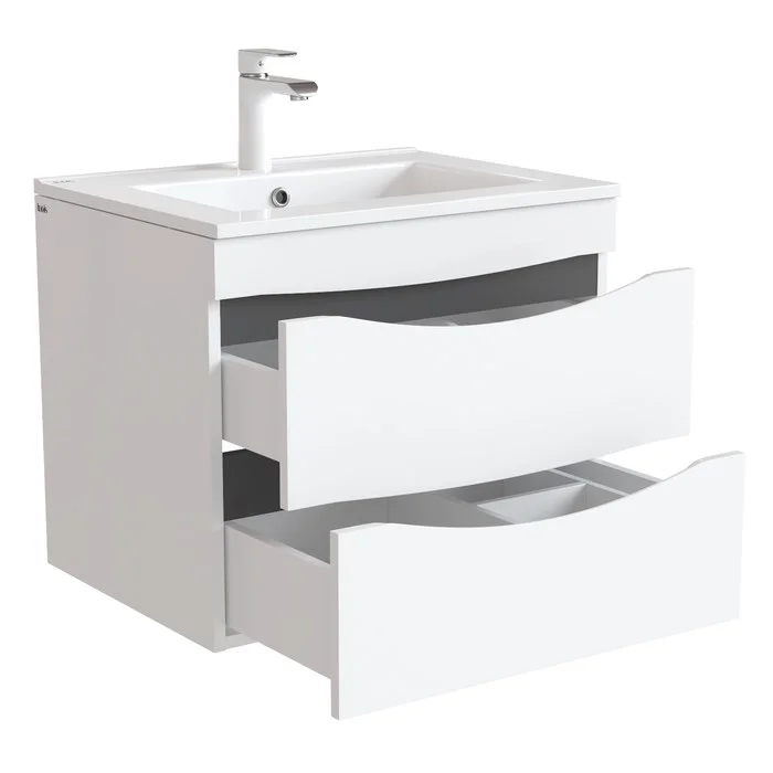 Тумба с умывальником для ванной комнаты, подвесная. Ширина 60 см. Фасад МДФ в эмали, боковины ЛДСП. Два ящика,интегрированные ручки, перекатной организатор, пластиковый ограничитель под сифон. Плоский керамический умывальник. Упаковка: картон, пленка, пенопластовые уголки.