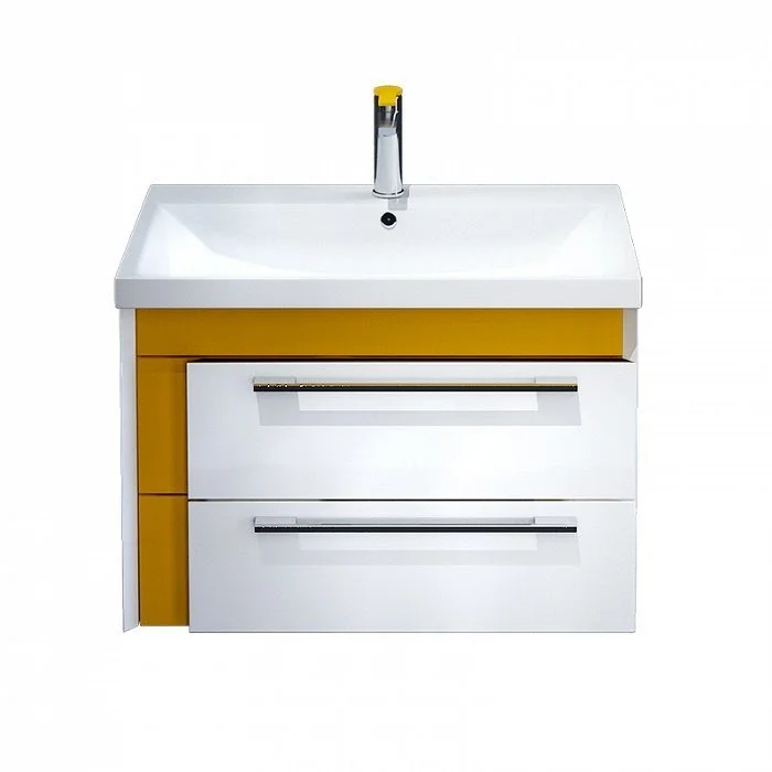 Тумба с умывальником для ванной комнаты, подвесная. Ширина 70 см. Фасад МДФ 16мм в эмали, боковины ЛДСП белый глянец/горчичный. Два выдвижных ящика с механизмом плавного доведения. В комплекте сифон с выпуском.