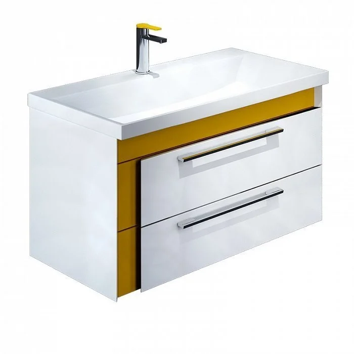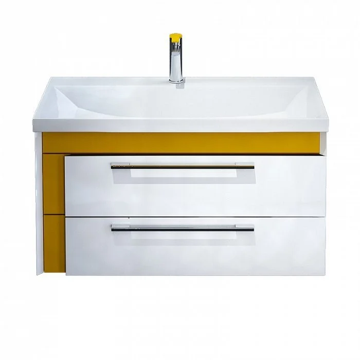 Тумба с умывальником для ванной комнаты, подвесная. Размеры тумбы без умывальника: 447х895х450 мм (ДхШхВ). Размеры умывальника: 450х900 мм (ДхШ). Фасад МДФ 16мм в эмали, боковины ЛДСП белый глянец/горчичный. Два выдвижных ящика с механизмом плавного доведения.
