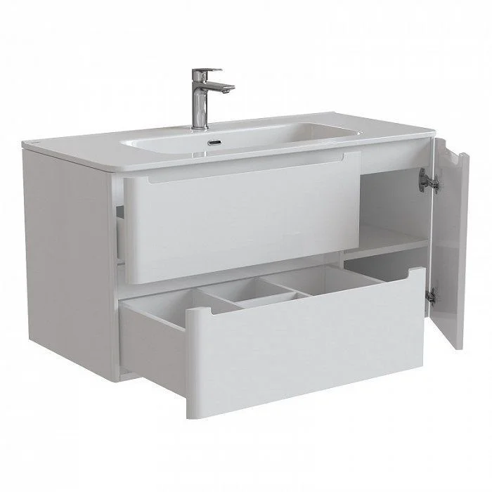 Два выдвижных ящика с механизмом плавного доведения. Одна распашная дверца с полкой ЛДСП 16 мм. Пластиковый ограничитель под сифон в верхнем ящике.